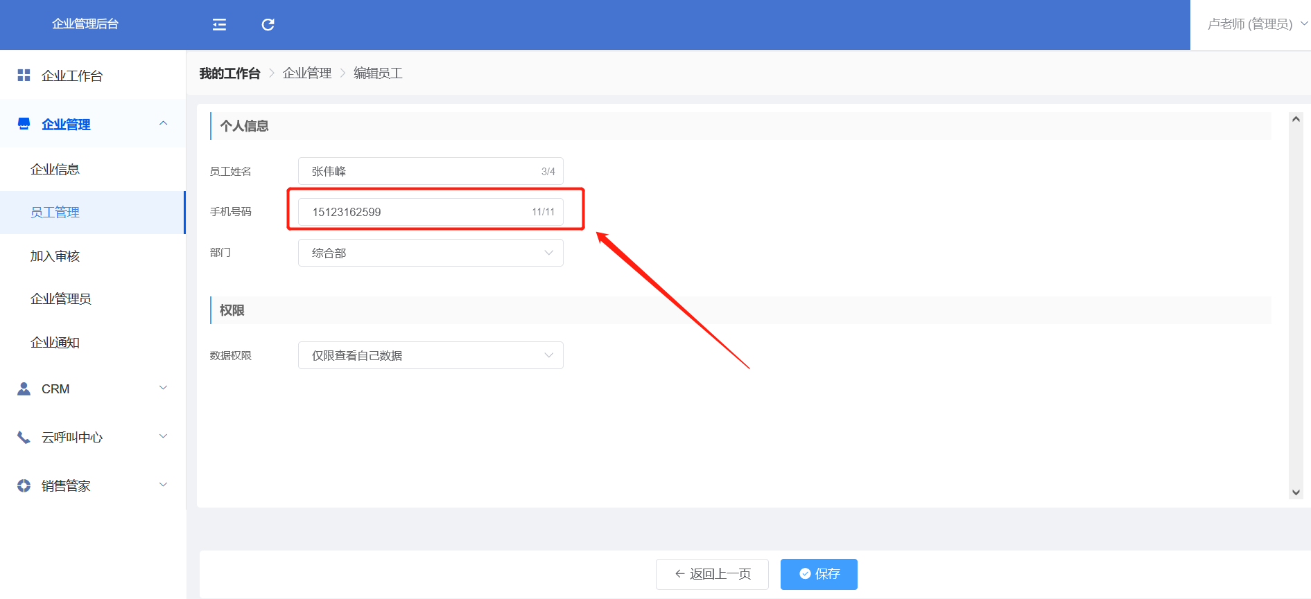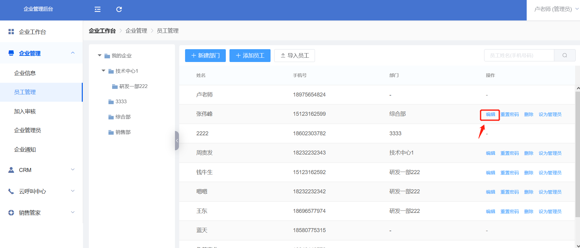管理员登录后进入管理端【企业管理】-【员工管理】点击右侧编辑